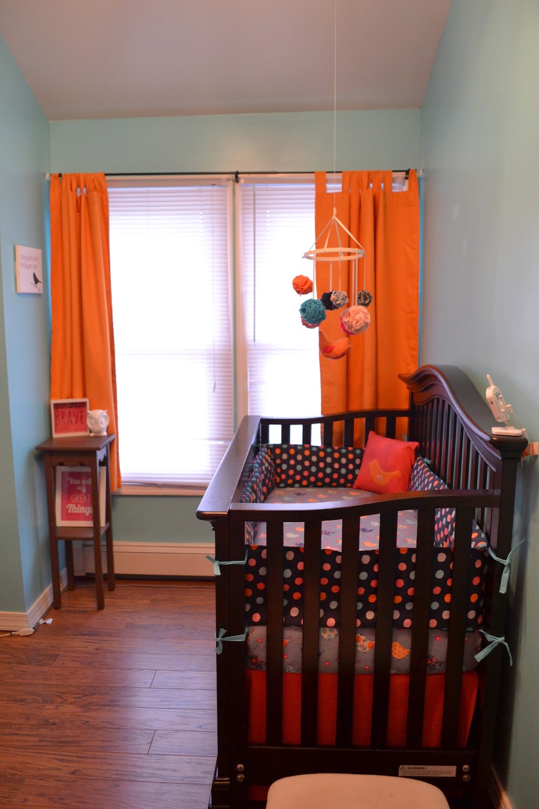 I used orange thread that was quadrupled up to attach the bird which was tied into the middle knot of the ribbon seen in the middle of the hoop. Then I used a thicker string to hang the mobile from the ceiling.